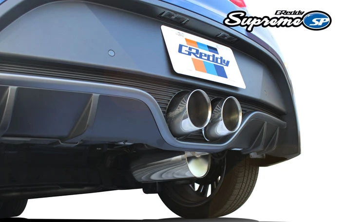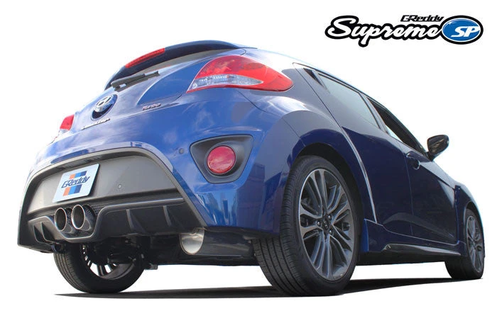 The Supreme SP, for the Hyundai Veloster, features an excellent combination of performance and sound. Large 76mm (3.0”) mandrel-bent piping is carefully routed underneath the compact chassis to an extra large resonator and compact, rear mounted, oval SP muffler. To finish off the system, a smooth dual 63.5mm (2.5”) split leads to a functional, remote center exit with 102mm (4.0”) GReddy engraved tips. Power tests have shown increased performance throughout the power-band, with peak gains of 12whp and 6ft.lbs. Sound is well controlled for street use, with no passenger compartment drone. Like all GReddy Supreme SP systems the fully hand-welded 304 Stainless-Steel exhaust carries a Limited Lifetime Warranty.