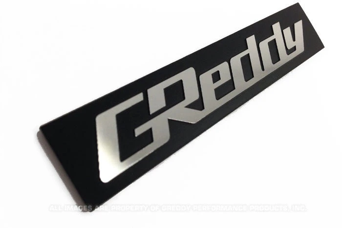 GReddy Logo Emblem – Perfectly sized to fit GReddy Intake Manifold reliefs. Self- adhesive back, black plastic, with brushed chrome finish. Raised GReddy logo (machined) Rectangular shape.