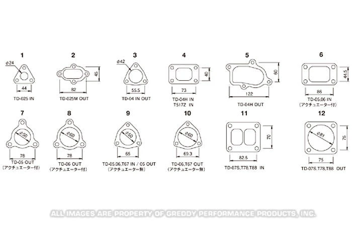 GReddy metal turbine flange gaskets for high pressure. 12 types for the various shapes of GReddy / Mitsubishi Turbine Housings.